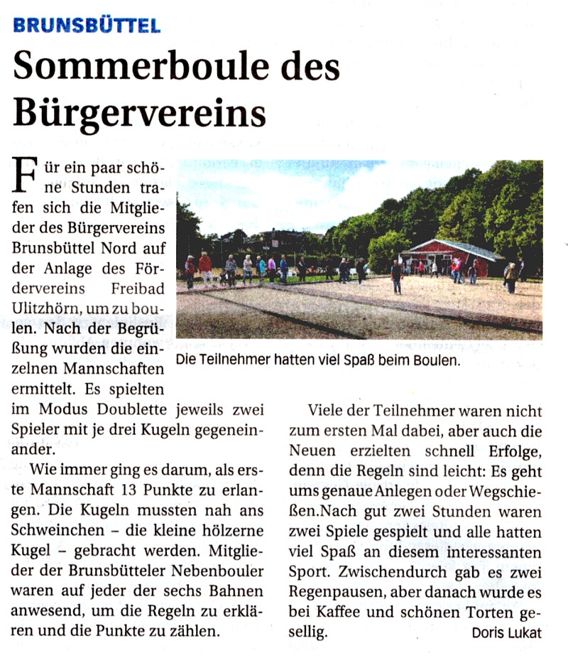 Für ein paar schöne Stunden trafen sich die Mitglieder des Bürgervereins Brunsbüttel Nord auf der Anlage des Fördervereins Freibad Ulitzhörn, um zu Boulen.