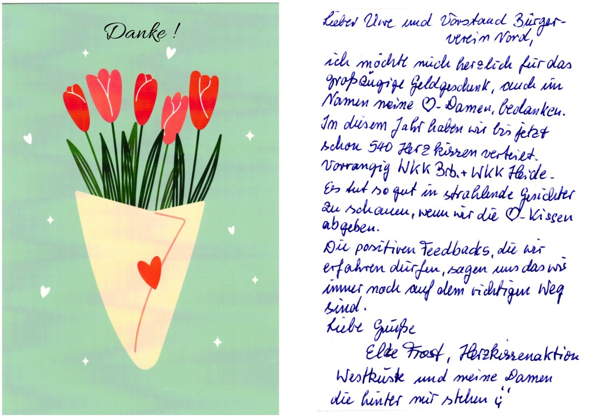 Der Verein bedankt sich bei der Herzkissenaktion Westküste und allen "Mittätigen" - auch im Namen vieler Krebspatientinnen und - patienten -