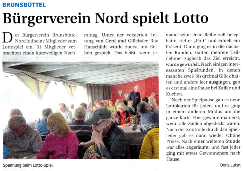 Der Bürgerverein Brunsbüttel Nord lud seine Mitglieder zum Lottospiel ein. Im Vereinshaus des FFU verbrachten 34 Mitglieder einen kurzweiligen Nachmittag. Unter der versierten Leitung von Gerd und Glücksfee Rita Hauschildt wurde zuerst um Reihen gespielt. Das heißt, wenn jemand seine erste Reihe voll belegt hatte, rief er „Pott“ und erhielt ein Präsent. Dann ging es in die nächsten Runden. Hatten mehrere Teilnehmer zugleich das Ziel erreicht, wurde gewürfelt. Nach einigen interessanten Spielrunden, in denen manche 2 bis 3 Mal Glück hatten und andere leer ausgingen, gab es erst mal eine Pause bei Kaffee und Kuchen.